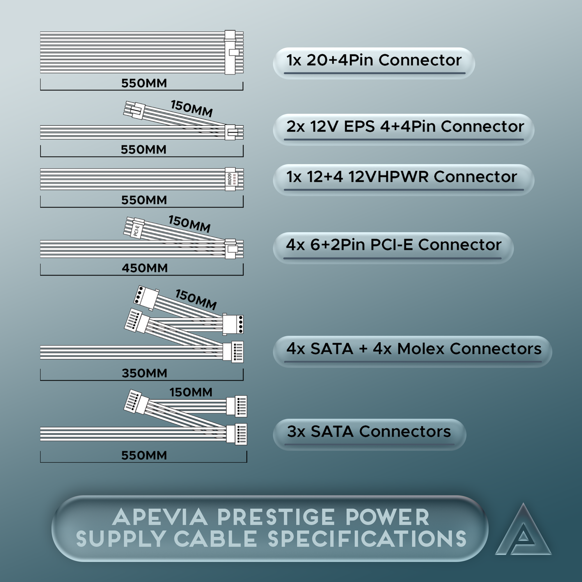 user manualApevia’s Prestige PCIe 5.0 White edition series line of power supplies brings great power and efficiency to your computer system while offering a clean full white aesthetic look to your setup. 80+ Gold certified, and designed for elegant form and function, they bring it to life. This power supply includes the PCle 5.0 / Gen 5 12VHPWR PSU connector to deliver power to the most advanced PCIe 5.0 high end graphics cards. Supporting the 12v2.3 standard and single rail setup, it’s updated for modern platforms. Boasting a 135mm silent white fan, it keeps everything inside cool. The Prestige line also uses Active PFC, with a 99% factor correction, boosting performance and saving energy. No toggle switch included, the power supply automatically switches between 110V and 230V depending on the power grid its attached to. RoHS compliance. For safety, do not overload, abuse or modify the power supply unit. NOTE: Power supply will not turn out if you do not connect everything correctly into your PC